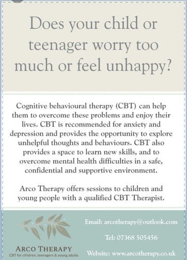 Arco Therapy is a local CBT service offering CBT to children, teenagers and adults. More and more children teenagers and adults are struggling with anxiety, stress and sadness, particularly following the covid pandemic, and often professional therapy is needed to overcome these difficulties.